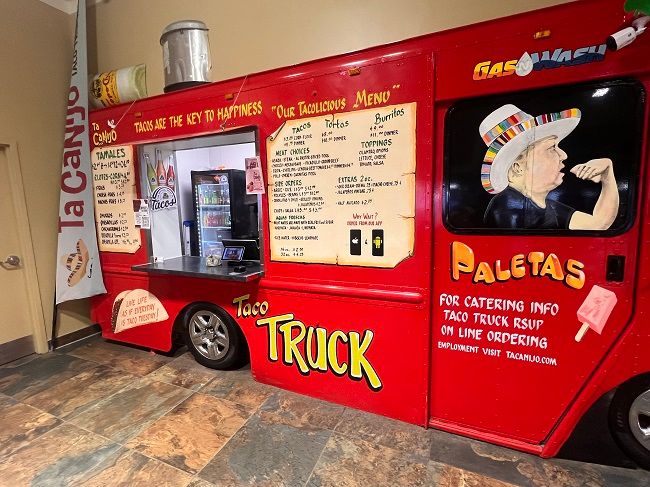 While the restaurants aren’t actually taco trucks, they all have their storefronts inside the gas station look like taco trucks. The red taco truck facade will grab your attention as soon as you walk in the door.