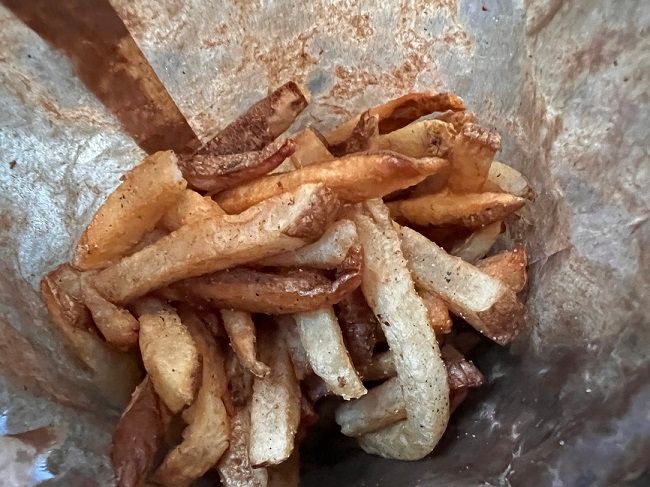 I ordered the fries because I knew I could eat fries in the car. These fries are fries I expect from any good restaurant in the Chicago area. They’re fresh cut, skin on fries that come out super greasy. You could almost see through the bag there was so much grease. That makes eating them a little harder but they’re so good. They’re my guilty pleasure kind of fries. I know how bad they are for me because I can literally see the greasy soaking up in the paper bag, but this is one of those foods that I associate with Chicago. The delicious, greasy, salty, fresh cut, skin on fries. They don’t need ketchup. They don’t need mustard. They don’t need any kind of knocks off fry sauce. They’re delicious just how they are.