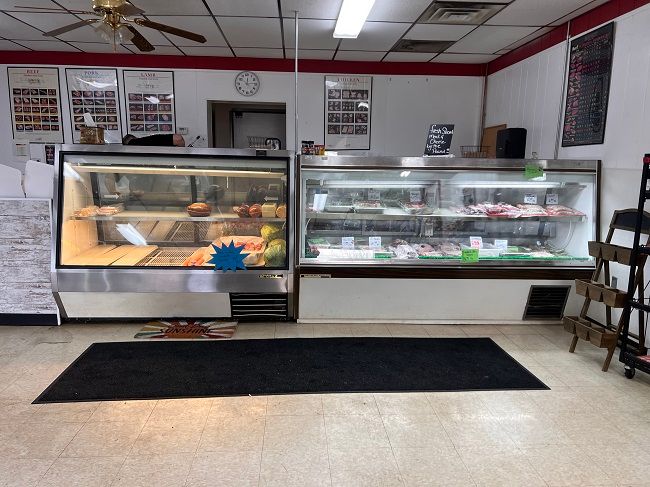 The back part of the room some deli meat selections and some fresh butcher counter meat. There’s also some frozen meat options in a freezer off to the side.
