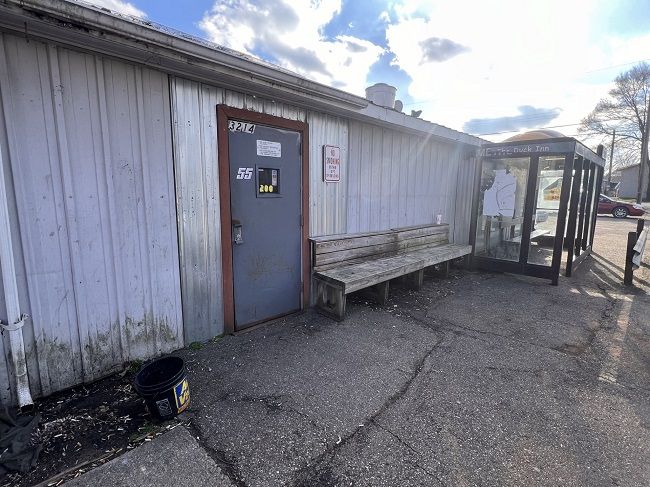 The Duck Inn-Waddle Out (great name, BTW) is on Brookfield Avenue at Olmstead Road kind of across the street from the Kalamazoo County Expo Center in Kalamazoo Township. The small, metal building doesn’t really look like a bar. There are no window, the metal siding is pretty beat up and dirty, and the entry door looks like it was put there as an afterthought. There’s an old Metro bus stop shed right outside the door so people have a place to smoke and get out of the elements.