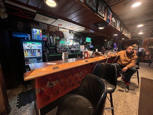 The bar isn’t really big. There is one row of tables squeezed between the wood paneled walls and the bar, the flooring is mismatched tile and carpet, and the decor is beer signs. There are dart boards on one wall and there’s a space for live music on the far end.