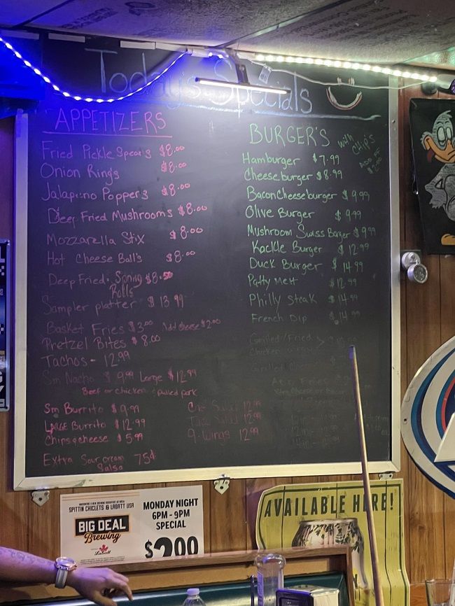 When I got my beer, I asked about the kitchen. The bartender pointed me to a chalkboard sign behind me near the pool tables. That’s where the menu was listed.