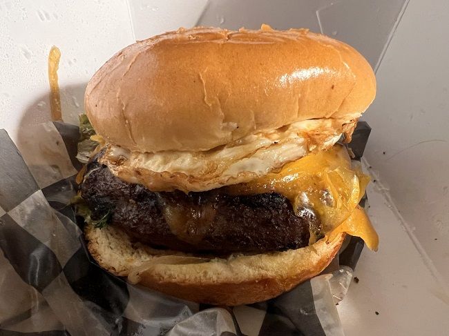 The burger I ordered was the Brunch Burger. This sandwich is a rather large burger patty served on a brioche bun with grilled onions, an over easy egg, and American cheese. I forgot to ask to leave the onions off but they were fortunately on the bottom of the patty so they were easy to remove. I was pretty hungry by the time I was ready to dive in to this sandwich so I took a big bite….and the over easiness of egg came spilling out the back. Boy, am I glad I was not sitting by people when this happened. I was so hungry I forgot that the egg was runny and would likely create a mess if I went to hard. I laughed about my mistake then went right back to scarfing this thing down. It was a really delicious burger and hit the spot after a 16 hour work day that included several hours of travel.