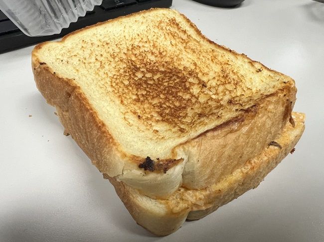 I got back to the office and opened up my sandwich. It was kind of a cross between a grilled cheese and an chicken salad sandwich. It was nice and toasty on the outside and filled with delicious buffalo chicken in the middle. There’s some cheese in there as well but it’s not the kind of grilled cheese you would pull apart and have super stringy cheese in the middle. This sandwich was constructed much more like a chicken salad…but Buffalo style.