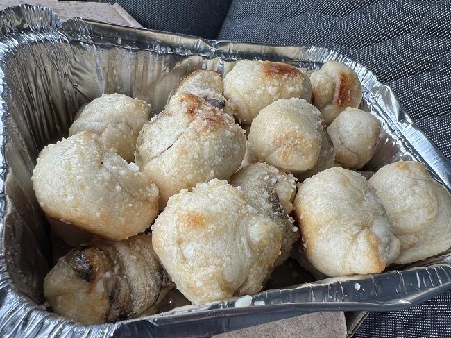 The DOH Tots are small pizza dough bites covered with Parmesan cheese. The order is much larger than I expected. The Tots were pretty tasty and much easier to eat than bread sticks…but they still tasted like bread sticks. These were a good choice and I actually had the foil pan finished before I got to the far side of Petoskey.