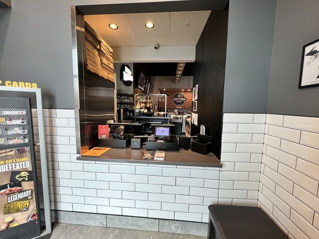 I realized I was going to need to go back outside and go in the carry-out door to pick up my pizza. There were two windows in the very small carry-out area and from here, you can see how the kitchen is shared between the two brands. The pizza carry-out counter looks in to the dining room while BWW’s looks in to the kitchen. The idea of two windows is kind of funny because the same people work both of them and it was actually someone standing at the B-Dubs carryout window who asked me for my name and got my pizza.
