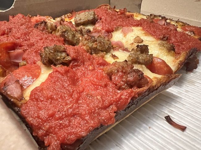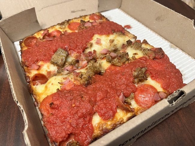 I couldn’t wait to get to my hotel to dig in to my pizza. The Detroit style 4-slice Motown Meat Lover pizza is topped with pepperoni cups, smoked bacon, Italian sausage, smoked ham and pizza sauce.