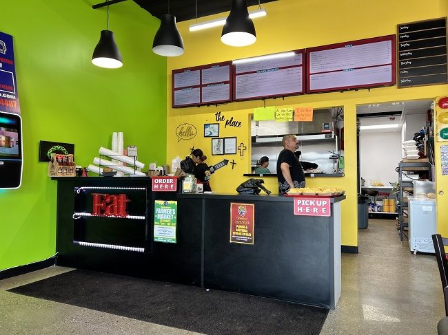 The restaurant is set up as a counter service, fast casual restaurant. The menu board hangs above the register and above the opening in to the kitchen.