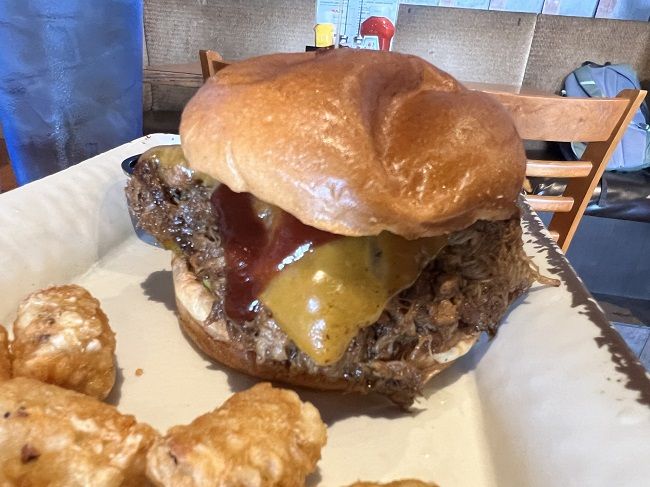 J also did a build your own sandwich but she went with Pulled Pork instead. She also did the brioche roll and added pickles, sharp cheddar and BBQ sauce to the meat. J is pretty particular about pulled pork. She likes it went it’s kind of thin and covered in sauce. There was a lot of meat packed tightly into the sandwich. I had a feeling when it was set down that this wasn’t going to be her favorite. She tried though and ate about half of it. I boxed the rest up and took it home for lunch on Sunday. I see where she’s coming from. I liked it but I know what her preference is. There was a vinegar sauce on the meat in addition to the sweeter sauce that was added. She wasn’t a fan but I was happy to take it home for lunch.