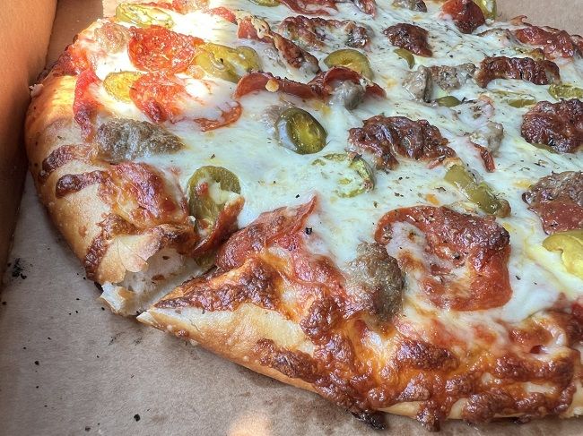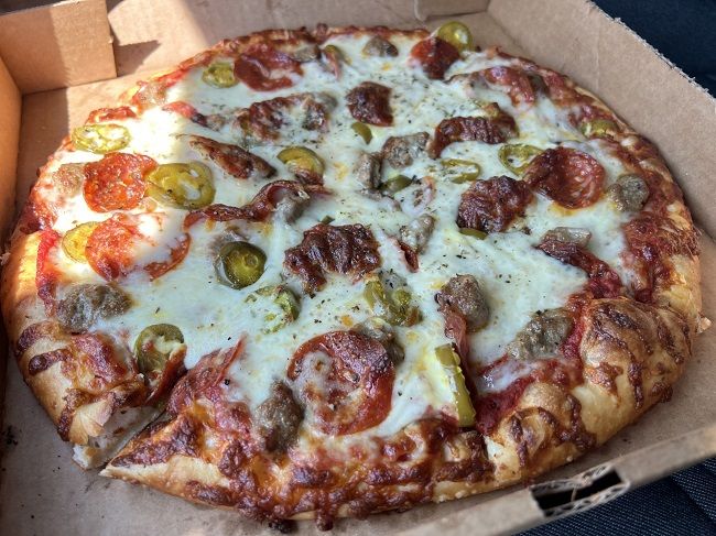 The first thing I noticed was how much cheese is on the pizza. There was a lot of it. As I tried to rip away the first slice the rest of the pizza was trying desperately to cling to the triangle I was attempting to pull away. The pizza was covered in crispy pepperoni, big pinches of sausage and slices of jalapenos. All of it was cooked to a nice golden brown. The pizza was delicious and super filling. I only ate four slices sitting in a park near Douglas waiting for a co-worker then I took the rest home. I was going to take it to work the next day but it didn’t last that long. I couldn’t help myself and just finished it off later that night before going to bed.