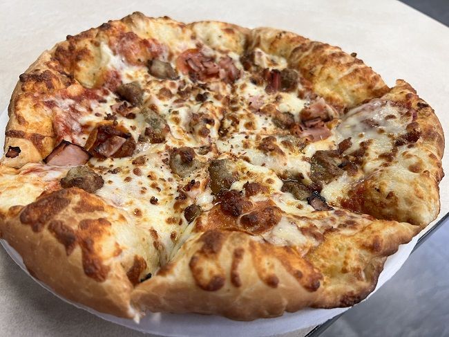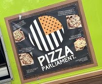 The pizzas are nine inch pies and they all have politically themed names. I chose the one called Meat Monopoly.