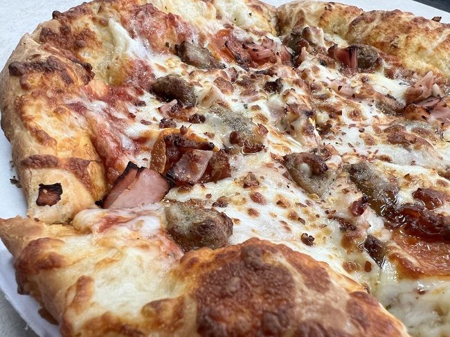 The Meat Monopoly is topped with pepperoni, bacon, ham, and sausage. The pizza is a pretty thick doughy crust topped with a thin layer of sauce and a lot of cheese. I’m usually a more sauce the better kind of pizza eater on this type of pizza but it makes sense to have a pizza that isn’t going to be a big mess. The pizza had a nice golden brown color on the crust and a little bit of charring on the meats that were poking through the cheese. I do appreciate this being a little bit thicker crust than what you’d get a a wood-fired pizza food truck. While I love those, they’re not always super filling. This one was. The 9″ pizza was perfect for a sitting at my desk lunch.