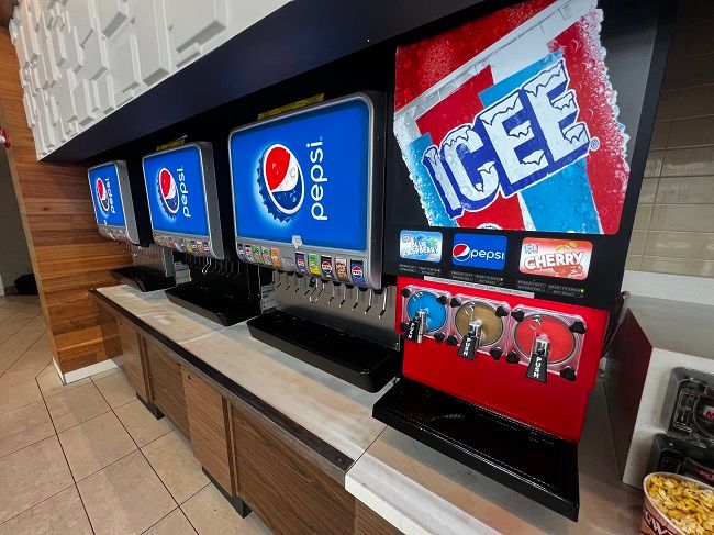 The popcorn is filled behind the counter but drinks are self serve off to the side right before you head back to the auditoriums. There are several Pepsi machines and an Icee machine. We filled up our drinks then headed to find out theater.