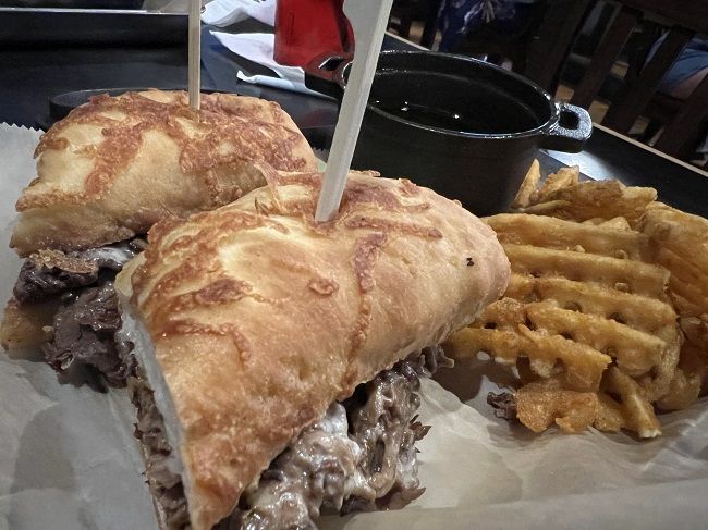 My colleague went in a totally different direction and ordered the BBQ Smoked Pulled Pork Baked Potato. This plate is a jumbo smoked baked potato with pulled pork, beer cheese, and house smoked maple bacon. We still had a little bit of work to do when we got back to the hotel and he acccused me of putting him to a “food coma.” Needless to say, he enjoyed his meal to.