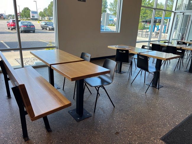 The rest of the space is the dining room. There is a lot of natural light that comes in through the floor to ceiling windows on two sides. Chipotle, like many fast casual chains, uses a combination of chairs and benches that are comfortable just long enough to eat a burrito then they start to hurt your back.