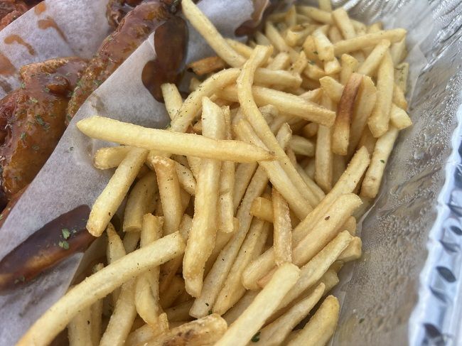 The order also came with fries. We didn’t necessarily want fries but all the wings come with them. There were no complaints. We ate them. They are simple frozen French fries. I ended up using some of the leftover sauce in the pain to dip them in.