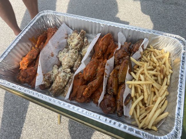 We got the park not long after the parking lots open. My dad brought a table, a trash bag, and a ton of napkins so we got set up with the huge foil pan filled with all of the crispy, juicy, saucy wings.