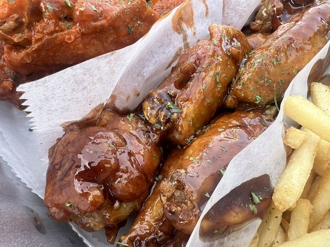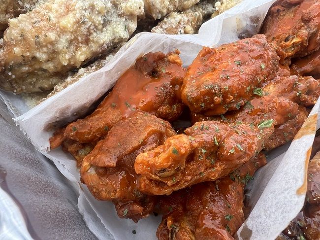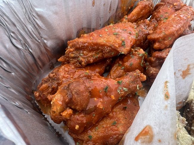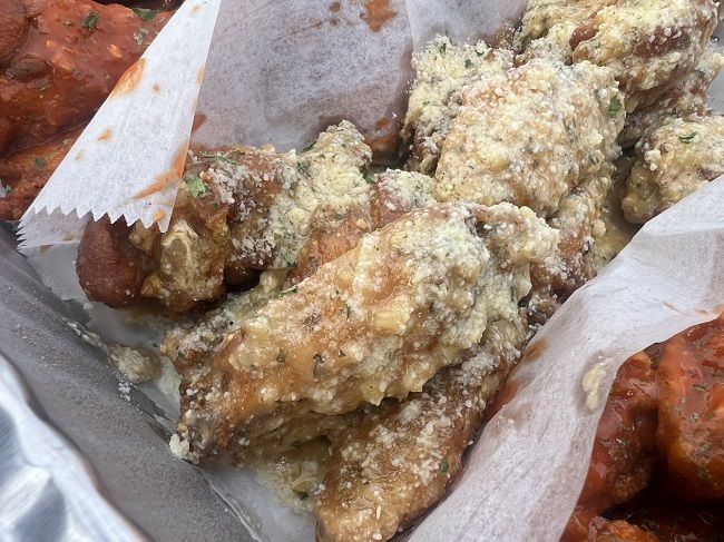 The first section of wings in the pan were the Spicy Garlic. These are my favorite and a favorite of mine to make at home. I love combination of Buffalo sauce and chunks of garlic. My brother grabbed one of these right away and it was an instant nostalgia hit for him. He remarked how crispy the wings were despite abundance of the spicy sauce.