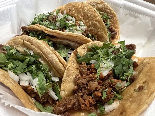 The five tacos took up the whole Styrofoam container. Each was double wrapped in corn tortillas and filled with a huge serving of tender steak and chopped onion and cilantro.