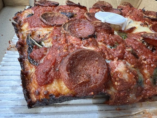 The pizzas was just overflowing with toppings. The small pizza is only four slices but it’s four very filling slices. There is a really good crispy edge to the soft, buttery crust. The pepperoni have a char all the way around them and add a bit of a crunch with each bite. Some Detroit style pizzas can be light on sauce but this one has it oozing off each slices. It’s just a really solid, really delicious pizza.