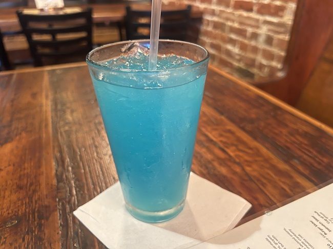 L was boring and just stuck to water. B ordered the Blue Tornado. This mocktail is a lemonade with blue raspberry syrup, brew glitter which they say “creates a shimmering swirl” and topped with a rainbow sour candy. He was going to order the Superhero Elixir because it’s finished with a gold sugar rim…but they didn’t have the gold sugar. He was happy with the Blue Tornado and probably spent too much time swirling the glitter.