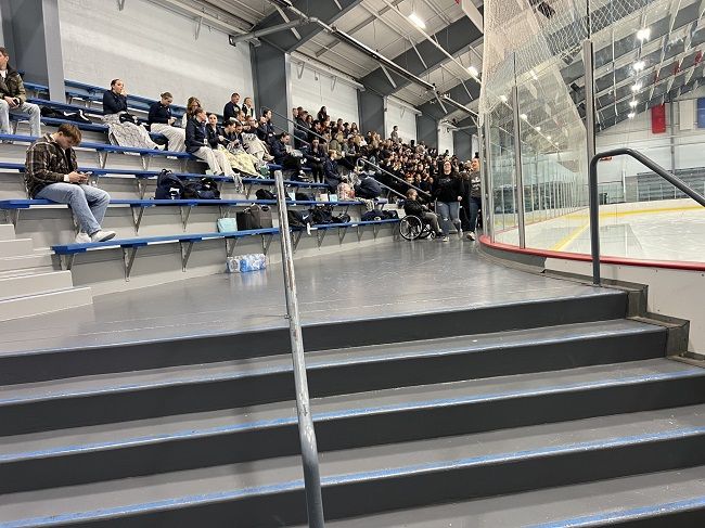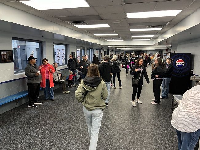 The seating starts at level of the dasher boards so you do have to go up a short flight of stairs to get to the bleachers. The seats are permanent concrete stands with a seating bench bolted to it. I didn’t see any ADA accessibility coming from the main lobby but I’m sure it has to be there somewhere. There are some benches along the wall behind the goals and there were a few people with walkers that just chose to sit there.