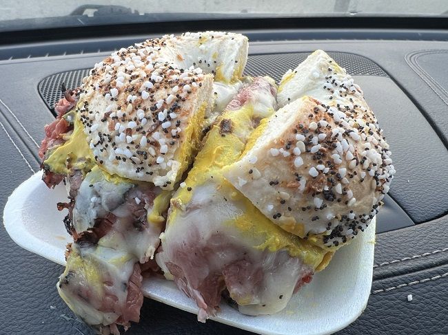 I ordered myself a pastrami sandwich (at 8:00 AM) with Swiss cheese and mustard on an everything bagel. The pastrami was fresh sliced then warmed up in the microwave. I guess I should have asked but the bagel wasn’t toasted. I didn’t even think to ask so that was my fault. The huge pile of meat was covered with a slice of melted Swiss cheese and a light spread of mustard. The cost for the sandwich was right around $15.
