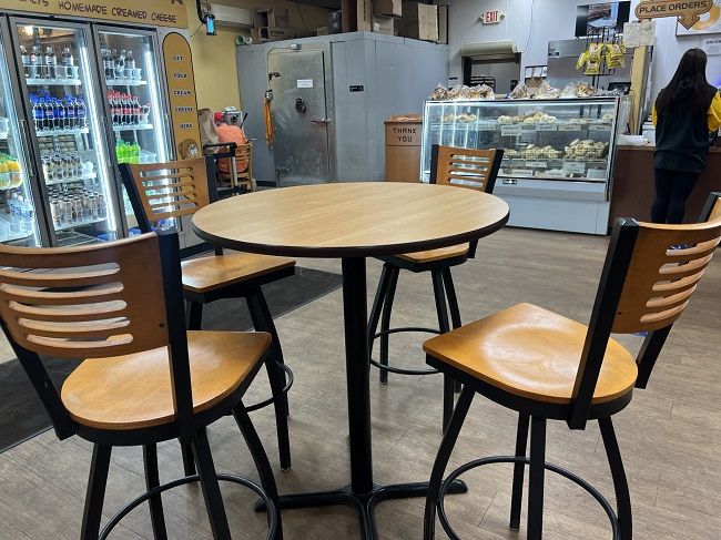 There is a cooler off to one side where they have drinks, cream cheese, and some of their well loved pre-made pizza bagels. There are also a couple of tables in this area but really, it’s just a lot of empty space to wait on those busy days when everyone is getting a bagel.