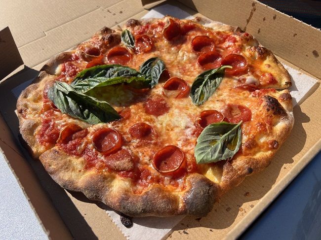 My pick was the Santino. This pizza is pepperoni, hot honey, and fresh mozzarella. It took about ten minutes from the time I ordered until the time my number was called again. The pizza is paid for after it comes out of the oven so I went back to the counter and paid. They take credit card but they add on a buck or two for the service fees so the total for my pizza was $23.