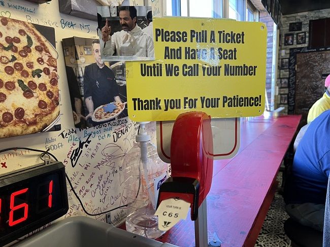 You can’t just walk in to Fredi’s and order a pizza. They don’t like to get ahead of themselves so they only take orders depending on how much room is in the oven. There are several signs on your way in telling you to pull a ticket and wait. When the ovens clear up, they start calling numbers to put in orders.