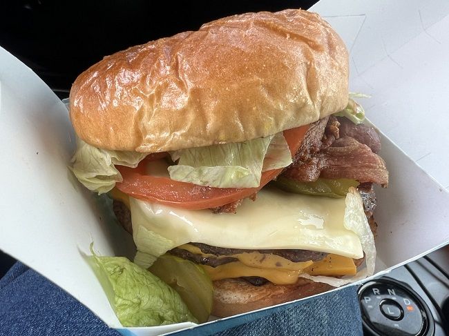 There was no one in line at the speaker when I pulled up to the drive thru. I put in an order for the Bacon Two Cheese Stackburger Combo with fries and a Coke. I thought long and hard about adding an order of cheese curds to the order and even a Blizzard but I didn’t do it and just got my burger and fries. The cost was a little over $15 and it was ready not long after I got to the pick up window.