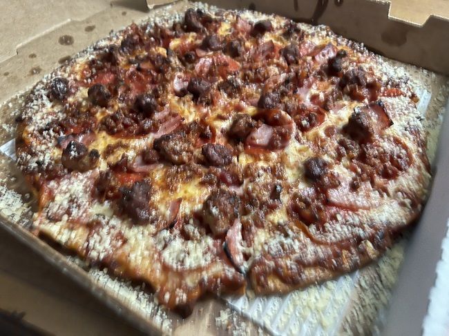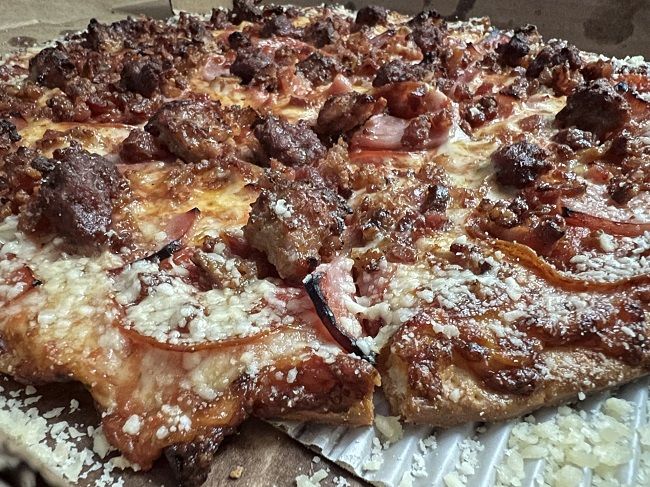 The pizza I ordered was a thin crust Meat Special. It comes topped with pepperoni, ham, bacon, Italian sausage, and ground beef. I also added the Parmesan crust. That’s something I really like but my family really doesn’t so I can never do it when I get pizzas with them (Sorry for the potato picture here)