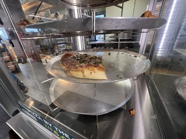 When I got back to the car, I decided to eat the pizza before I left. They actually had bottles of Frank’s Red Hot next to the pizza cabinet. I put a lot of Frank’s Red Hot on the slice because this is the kind of pizza I really like with hot sauce. It’s a pretty doughy slice of pizza….slightly undercooked but not raw. It’s solid gas station pizza but going for the hot sauce was the right move.