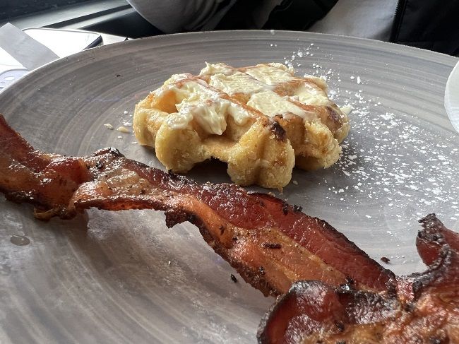 L’s breakfast turned out to be kind of funny. She wanted a waffle but she doesn’t always eat a whole waffle. There was an option for half a waffle and we thought, “perfect.” The half a waffle was tiny. Like, smaller than a kids portion tiny. I don’t know what the full waffle is but we were definitely expecting a little more than this. She said it was delicious. It came with whipped butter and powdered sugar, but yeah…definitely thought it’d be a little bigger. B didn’t eat all of his pancake so he didn’t leave hungry. She also got bacon and toast which what she typically does for breakfast.