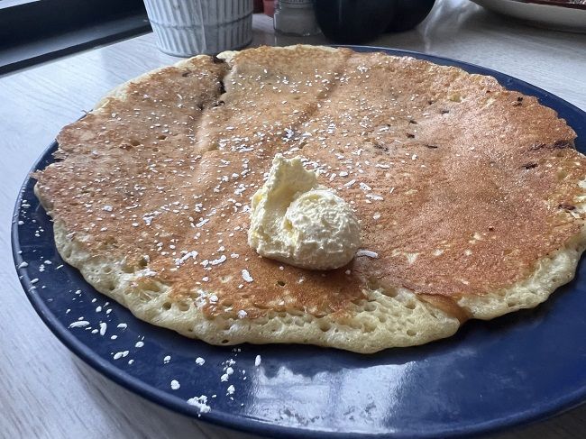 We didn’t see it or we didn’t get a kids menu. Not sure which it was but B just wanted pancakes anyway. We ordered him one Bumpas Plain Pancake. It was huge and hanging over the side of the plate so we knew it would feed him. He really is pretty easy to please. Pancake. Butter. Syrup. The kid is easy to please.