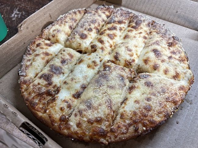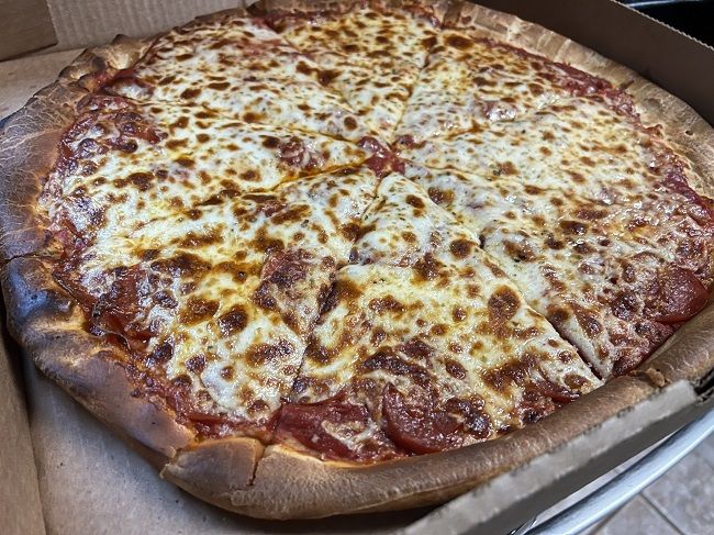 Bilbo’s brought pan pizza to Kalamazoo 40 years ago and while it’s good, we’re a family that prefers more of a thin crust. I got a large thin crust pizza with pepperoni on half and the other half just plain cheese.
