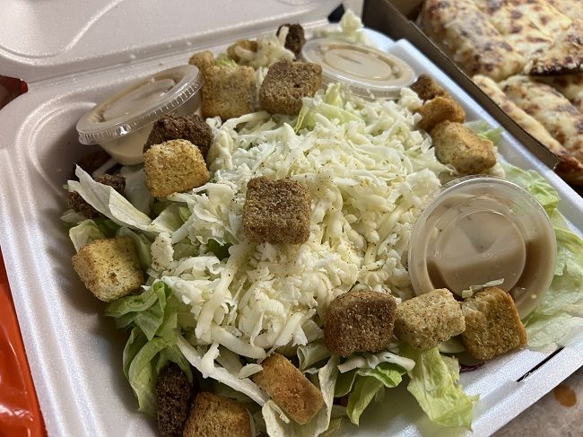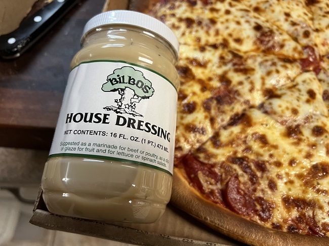 One of the big reasons we choose Bilbo’s is the salad dressing. It’s kind of an Italian dressing but it’s sweeter and has more of a zing to it. We always order the large family salad which is pretty simple. It’s just lettuce, cheese, and croutons. They put three small portions of the salad dressing in with the salad but those don’t go very far. J and L both go right for the salad and bypass the pizza at first.