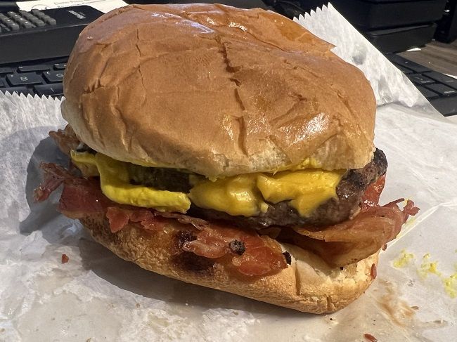 The burger is pretty simple too. It kind of has the taste of a backyard cookout. It’s a frozen burger patty topped with cheese then I added on some bacon (and it was nice and crispy), pickles and mustard. The whole thing is on a simple white bread bun. It’s nothing that will not your socks off but it is a pretty tasty burger and it won’t break the bank when you just need something quick, cheap, and tasty for lunch.