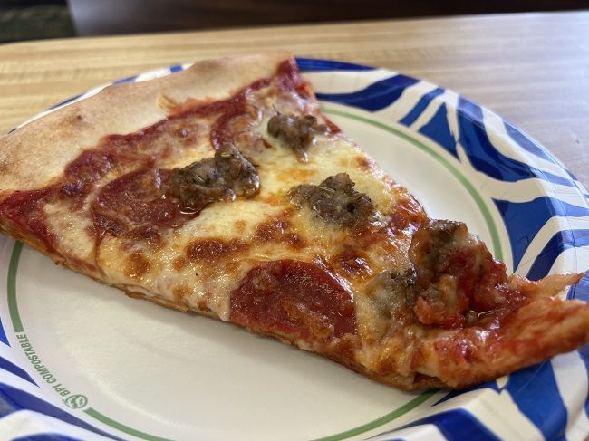 The slice of pizza was given to me on a paper plate. There are a few booths along the outside wall so I squeezed in to one of those (they’re not made for dads with oversized bellies) to eat while I was waiting.