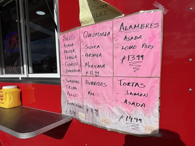 The menu is handwritten on sheets of pink paper and taped to the truck right next to the order window. I put in my usual order of four steak tacos. The cost was right under $15. I had cash so I just used that instead of asking if they took card.