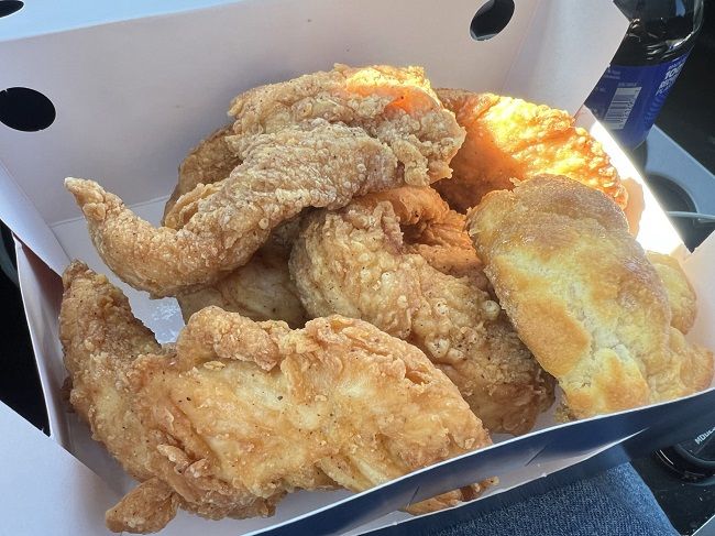 I ordered the six piece tenders which also comes with a biscuit. I added on a couple of Pepsi’s from the convenience store cooler. The guy who boxed up the chicken passed it to another guy working the register. The cost including the two pops was right around $15.