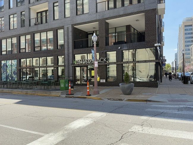 Shake Shack’s St Louis location is on Euclid Avenue and West Pine Boulevard not too far from Barnes Jewish Hospital. The multi-story, multi-use building was built on this corner about ten years ago replacing a single story commercial building that was anchored by a dry cleaner. Shake Shake takes up the prominent bottom floor corner space and is accessible from either Euclid or Pine Boulevard.