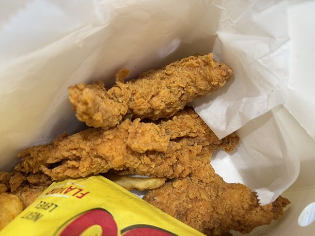 The menu isn’t very big and consists almost entirely of chicken. The last, and only other, time I have eaten at a Bojangles, I got full pieces of chicken. I didn’t even see that on the menu this time and I wanted something I could eat in the car a little more easily so I ordered a five piece Chicken Supremes (tender) combo with buffalo sauce, seasoned fries and a biscuit. The cost came out to just a little over $13.