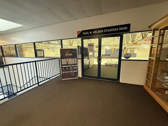 When you’re standing in that lobby area, there is a large rink off to the right known as the Paul R. Helber Stadium Rink. This is one of the two NHL sized rinks in the Ice Cube. There three entrances through glass doors that take you from the lobby area to the top of the seating in the rink. The rink was named after a longtime hockey coach and referee in 2022.
