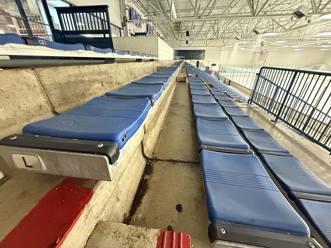 The seating is mostly on the side you walk in to. It’s all molded plastic seats mounted on concrete. There are heaters that weren’t turned on most of the time but it was still comfortable without a coat most of the time. For bigger competitions (like the Porter Synchronized Skating Classic) there are some metal bleachers in the corners that can also be used for seating. These aren’t available and aren’t needed during Springtime.