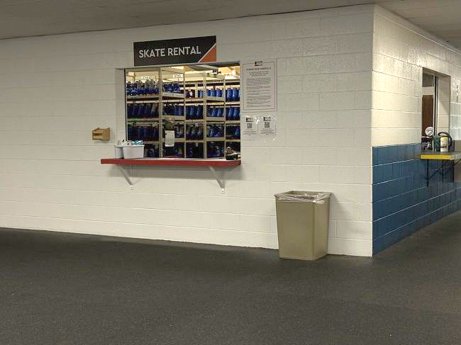 If you do public skate here, this is where you’d go. There’s a window in the wall near the entrance to Stadium Rink for public skate skate rentals.