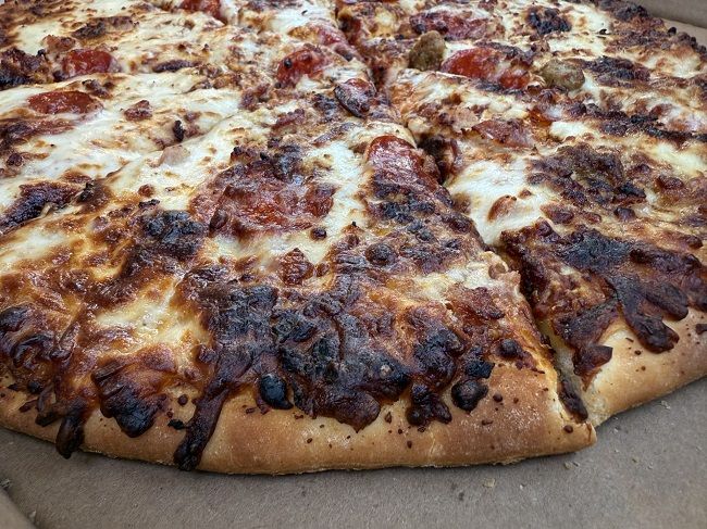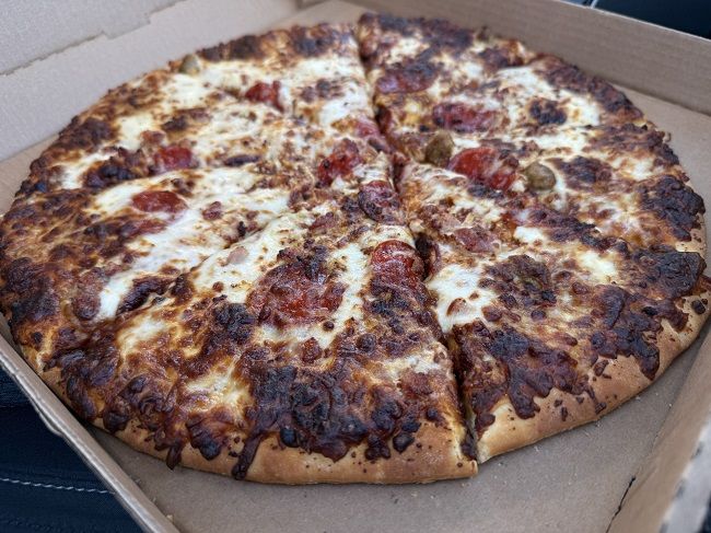 I opened up the box to find the pizza pretty well done. I don’t mind well done pizza but this one was pushing burnt in some spots.