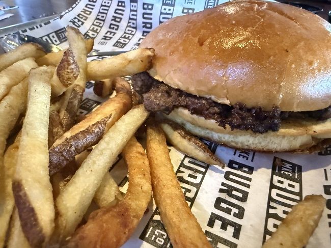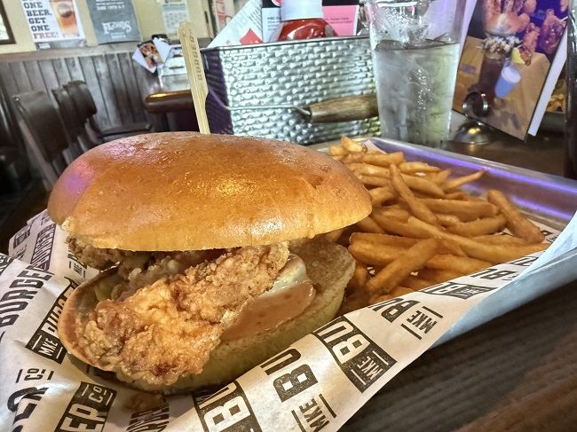 The focus of the menu is burgers but that’s not the only thing on the menu. J and my mom both ordered the MBC Chicken Sandwich. A fried chicken patty is topped with dill pickles and their “famous” Burger Co Sauce served on a buttery bun. You can add cheese for a buck and you can add a wing sauce for a buck. J and my mom both said the chicken was super crispy but still juicy in the middle. J ate about half of hers because she filled up on cheese curds so we took the rest back to the hotel. J picked the beer battered fries for her side while my mom went with kettle chips.