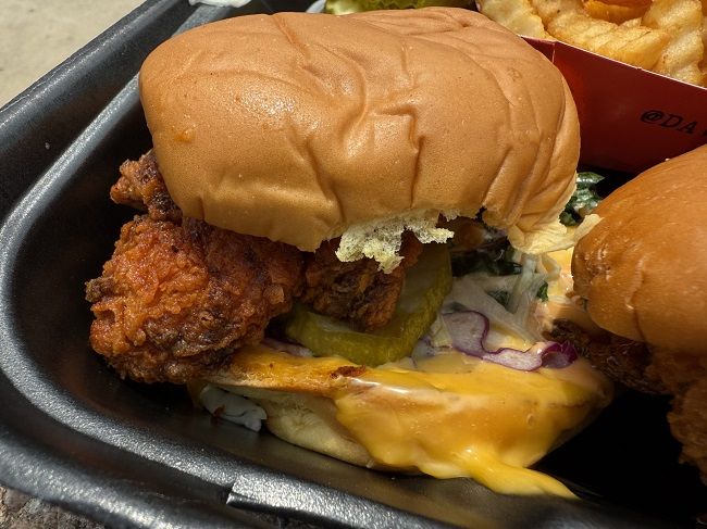 I was kind of leery at first but I do really like that they offer two sliders instead of one big sandwich. Each of the sliders a big piece of fried chicken covered in sauce. I picked the hot sauce which was hot, but I could have gone hotter. Each of the sandwiches is finished off with kale slaw, pickles, and Dave’s sauce on a potato bun. The sliders are three to four bite sandwiches so you get a bit of everything in each bite. The chicken is super crispy and really juicy. If I had gone back to my previous blog post from East Lansing, I would have remembered that I wanted to go hotter next time….oh, well, next time maybe I’ll remember. It was still a tasty sandwich.