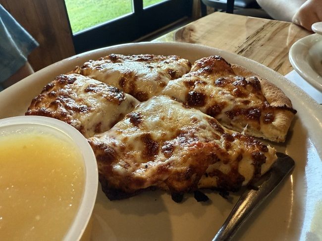 B was sitting next to me, and again, because of the volume in the restaurant, J couldn’t hear what he ordered. I let him get what he wanted. A cheese pizza. But J was a little mad at me because he doesn’t always eat restaurant pizza. Turns out, he really likes Louie’s pizza. The kids’ pizza is a personal size pizza and comes with just cheese. You can add toppings for $.50 but B just likes cheese pizza. We’ve always really liked Louie’s pizza and ordered it several times for pick up during the pandemic from the Trophy House. We were actually all a little bummed that he ate it all because we all kind of wanted a piece but B proved us wrong and polished off the whole thing. He also chose the applesauce as his side.